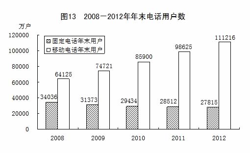 全年完成郵電業(yè)務(wù)總量[14]15022億元,比上年增長13.0%。其中,郵政業(yè)務(wù)總量2037億元,增長26.7%;電信業(yè)務(wù)總量12985億元,增長11.1%。郵政業(yè)全年完成郵政函件業(yè)務(wù)70.74億件,包裹業(yè)務(wù)0.69億件,快遞業(yè)務(wù)量56.85億件。電信業(yè)全年局用交換機(jī)容量新增478萬門,總?cè)萘?3906萬門;新增移動(dòng)電話交換機(jī)容量[15]11234萬戶,達(dá)到182870萬戶。年末固定電話用戶27815萬戶,其中,城市電話用戶18893萬戶,農(nóng)村電話用戶8922萬戶。新增移動(dòng)電話用戶12590萬戶,年末達(dá)到111216萬戶,其中3G移動(dòng)電話用戶[16]23280萬戶。年末全國固定及移動(dòng)電話用戶總數(shù)達(dá)到139031萬戶,比上年末增加11896萬戶。電話普及率達(dá)到103.2部/百人;ヂ(lián)網(wǎng)上網(wǎng)人數(shù)5.64億人,其中寬帶上網(wǎng)人數(shù)5.30億人;ヂ(lián)網(wǎng)普及率達(dá)到42.1%。