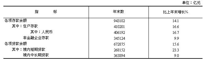 年末全部金融機(jī)構(gòu)本外幣各項(xiàng)存款余額94.3萬億元,比年初增加11.6萬億元,其中人民幣各項(xiàng)存款余額91.8萬億元,增加10.8萬億元。全部金融機(jī)構(gòu)本外幣各項(xiàng)貸款余額67.3萬億元,增加9.1萬億元,其中人民幣各項(xiàng)貸款余額63.0萬億元,增加8.2萬億元。全年社會(huì)融資規(guī)模[17]為15.8萬億元,按可比口徑計(jì)算,比上年多2.9萬億元。