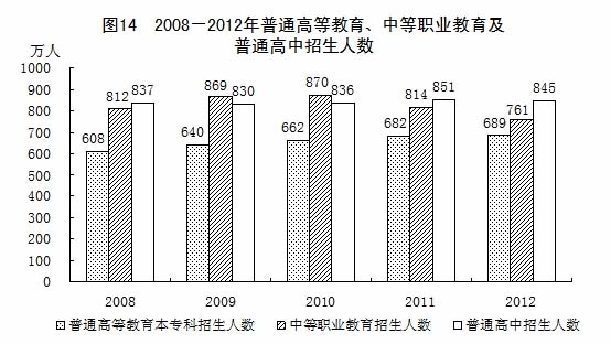 全年研究生教育招生59.0萬人,在學(xué)研究生172.0萬人,畢業(yè)生48.6萬人。普通高等教育本?普猩688.8萬人,在校生2391.3萬人,畢業(yè)生624.7萬人。各類中等職業(yè)教育招生761.0萬人,在校生2120.3萬人,畢業(yè)生673.6萬人。全國普通高中招生844.6萬人,在校生2467.2萬人,畢業(yè)生791.5萬人。全國初中招生1570.8萬人,在校生4763.1萬人,畢業(yè)生1660.8萬人。普通小學(xué)招生1714.7萬人,在校生9695.9萬人,畢業(yè)生1641.6萬人。特殊教育招生6.6萬人,在校生37.9萬人,畢業(yè)生4.9萬人。幼兒園在園幼兒3685.8萬人。