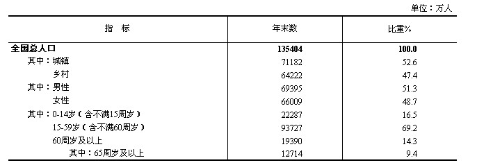 年末全國大陸總?cè)丝跒?35404萬人,比上年末增加669萬人,其中城鎮(zhèn)人口為71182萬人,占總?cè)丝诒戎貫?2.6%,比上年末提高1.3個(gè)百分點(diǎn)。全年出生人口1635萬人,出生率為12.10‰;死亡人口966萬人,死亡率為7.15‰;自然增長率為4.95‰。出生人口性別比為117.70。0-14歲(含不滿15周歲)人口22287萬人,占總?cè)丝诘?6.5%,比上年末提高0.01個(gè)百分點(diǎn);15-59歲(含不滿60周歲)勞動(dòng)年齡人口93727萬人,比上年末減少345萬人,占總?cè)丝诘?9.2%,比上年末下降0.60個(gè)百分點(diǎn);60周歲及以上人口19390萬人,占總?cè)丝诘?4.3%,比上年末提高0.59個(gè)百分點(diǎn)。全國人戶分離的人口[25]為2.79億人,其中流動(dòng)人口[26]為2.36億人。