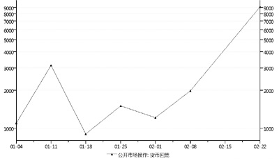 春節(jié)后的一周,央行出手大規(guī)模回籠貨幣達(dá)9100億元人民幣,此舉被市場理解為監(jiān)管層對國內(nèi)資金面開始進(jìn)行微調(diào),銀行系統(tǒng)和銀行間貨幣市場流動性出現(xiàn)拐點!巴鈪R占款較高是央行實行大規(guī);鼗\資金的主要考慮因素。”光大銀行首席宏觀分析師盛宏清預(yù)計,1月新增外匯占款可能達(dá)到6000億元,2月新增外匯占款則在4000億元附近,因此,央行通過重啟正回購防止流動性過度寬松,使M2增速持續(xù)高于目標(biāo)值。