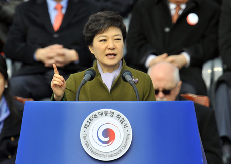 2月25日上午,韓國當選總統(tǒng)樸槿惠在韓國國會議事堂前的國會廣場正式宣誓就任總統(tǒng)。 樸槿惠在就職演說中說,將以“經(jīng)濟振興”、“國民幸!焙汀拔幕d盛”三大核心理念為基礎,為國民開啟一個充滿希望的新時代。樸槿惠說,政府將通過促進創(chuàng)造型經(jīng)濟和經(jīng)濟民主化來重振經(jīng)濟。她表示,為實現(xiàn)國民幸福,政府將改善社會福利,解決養(yǎng)老、育兒問題,并改善教育制度。