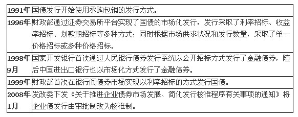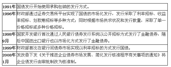 我國(guó)自1991年進(jìn)行國(guó)債發(fā)行方式的市場(chǎng)化改革,1997年銀行間債券市場(chǎng)成立之后,政策性金融債券和國(guó)債陸續(xù)開始通過(guò)公開招標(biāo)的方式發(fā)行,實(shí)現(xiàn)市場(chǎng)化定價(jià)。在2004年開始的新一輪債券市場(chǎng)創(chuàng)新中,面向金融機(jī)構(gòu)推出了一般性金融債、次級(jí)債、混合資本債、資產(chǎn)支持證券,面向非金融企業(yè)推出了短期融資券、中期票據(jù)、超短期融資券和集合票據(jù)等,均實(shí)行市場(chǎng)化方式定價(jià)。企業(yè)債早期由國(guó)家發(fā)展改革委審批,利率水平征求人民銀行意見,后來(lái)發(fā)改委簡(jiǎn)化企業(yè)債核準(zhǔn)程序,并逐步實(shí)現(xiàn)債券價(jià)格市場(chǎng)化。目前企業(yè)債發(fā)行利率仍然受到不得高于同期限銀行定期存款利率的40%的限制,短融和中票發(fā)行利率受到銀行間市場(chǎng)交易商協(xié)會(huì)公布的指導(dǎo)下限的約束,但總體上債券市場(chǎng)基本實(shí)現(xiàn)了市場(chǎng)化的定價(jià)方式。