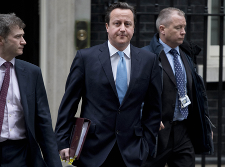 圖為英國首相卡梅倫27日正離開唐寧街10號(hào)首相官邸,準(zhǔn)備參加國會(huì)下議院的質(zhì)詢會(huì)議。