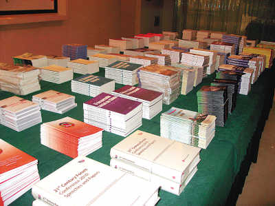 大堂的右側(cè)是圖書區(qū),大約有二三十種讀物,以外語類為主。根據(jù)新聞中心介紹,兩會期間,將提供涵蓋8個語種的300多種、3萬多冊圖書、資料,題材涉及政治、經(jīng)濟、文化、社會等各個方面,為記者認(rèn)識中國提供幫助。
