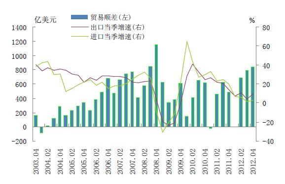 受國際大宗商品價格總體下跌等因素影響,進口價格下降。2012年各季度,紐約商品交易所原油期貨當季平均價格分別環(huán)比上漲9.5%、-9.4%、-1.2%和-4.3%,累計下降6.2%。2012