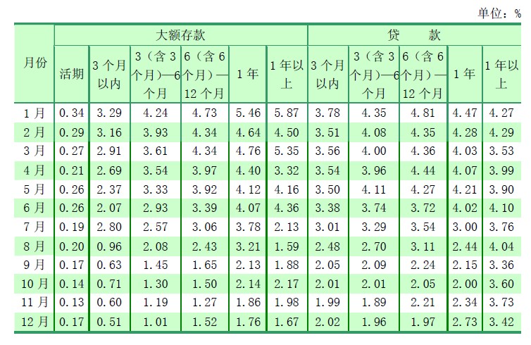 月份,中國人民銀行連續(xù)兩次下調(diào)存貸款基準利率,并小幅擴大利率浮動區(qū)間,金融機構(gòu)貸款利率進一步下降,并于年末趨于穩(wěn)定。12