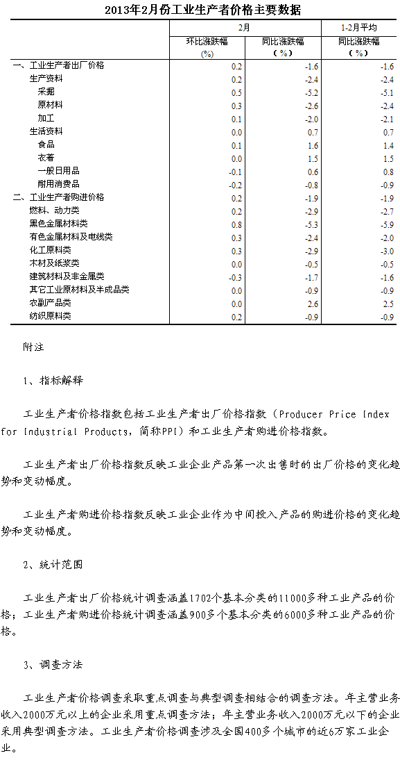 2013年2月份,全國工業(yè)生產(chǎn)者出廠價格同比下降1.6%,環(huán)比上漲0.2%。工業(yè)生產(chǎn)者購進價格同比下降1.9%,環(huán)比上漲0.2%。1—2月平均,工業(yè)生產(chǎn)者出廠價格同比下降1.6%,工業(yè)生產(chǎn)者購進價格同比下降1.9%。