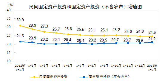 2013年1-2月份,全國(guó)民間固定資產(chǎn)投資15777億元,同比名義增長(zhǎng)24.6%,增速比去年全年回落0.2個(gè)百分點(diǎn)。民間固定資產(chǎn)投資占固定資產(chǎn)投資的比重為61.4%,與去年全年持平。