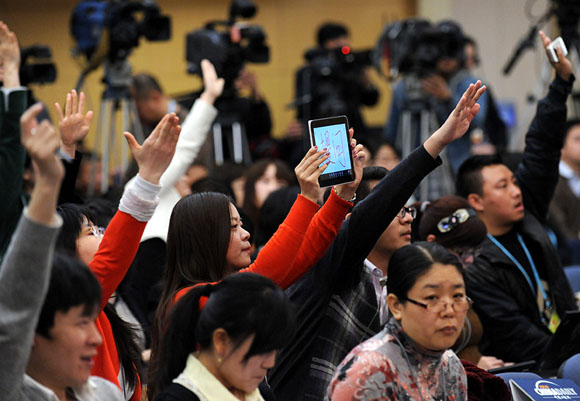 3月13日,十二屆全國人大一次會議新聞中心在梅地亞中心多功能廳舉行記者會。民政部部長李立國,副部長姜力、竇玉沛就“保障基本民生,發(fā)展社會服務(wù)”的相關(guān)問題回答中外記者的提問。圖為記者舉著ipad提問。