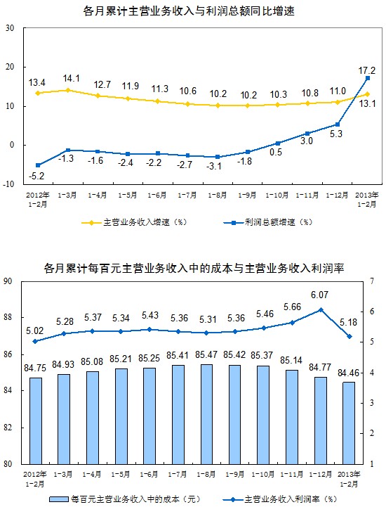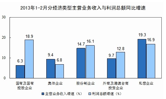 1-2月份在規(guī)模以上工業(yè)企業(yè)中,國有及國有控股企業(yè)實現(xiàn)利潤2125億元,比去年同期增長18.9%;集體企業(yè)實現(xiàn)利潤106億元,增長6.8%;股份制企業(yè)實現(xiàn)利潤4102億元,增長16.1%;外商及港澳臺商投資企業(yè)實現(xiàn)利潤1592億元,增長12.8%;私營企業(yè)實現(xiàn)利潤2306億元,增長16.9%。