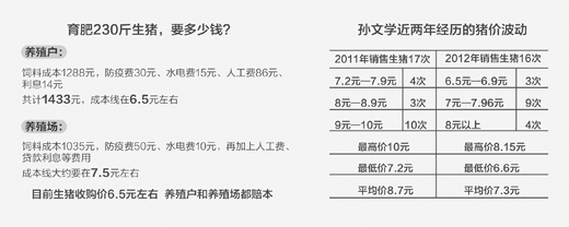 豬價(jià)不穩(wěn),對(duì)養(yǎng)殖戶(hù)而言并非新鮮事。在孫文學(xué)的賬本上,記錄著近兩年的生豬價(jià)格波動(dòng)情況:2011年銷(xiāo)售生豬17次,7.2元—7.9元4次,8元—8.9元3次,9元—10元10次,最高價(jià)10元,最低價(jià)7.2元,平均價(jià)8.7元;2012年銷(xiāo)售生豬16次,6.5元—6.9元3次,7元—7.96元9次,8元以上4次,最高價(jià)8.15元,最低價(jià)6.6元,平均價(jià)7.3元。