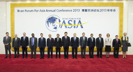 4月7日,國家主席習(xí)近平在海南博鰲同出席博鰲亞洲論壇2013年年會的外國領(lǐng)導(dǎo)人和國際組織負(fù)責(zé)人合影。