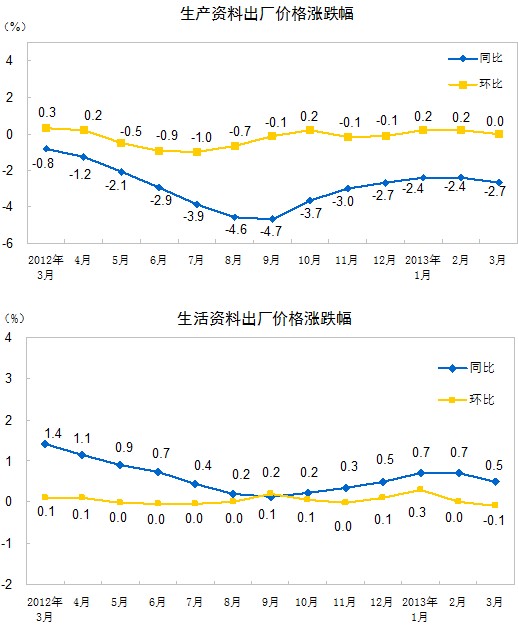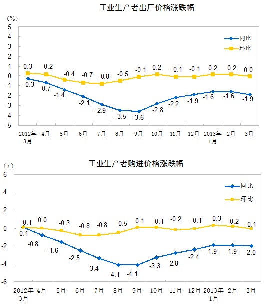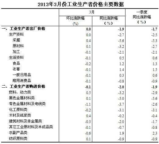 2013年3月份,全國工業(yè)生產(chǎn)者出廠價格同比下降1.9%,環(huán)比持平(漲跌幅度為0)。工業(yè)生產(chǎn)者購進價格同比下降2.0%,環(huán)比下降0.1%。一季度,工業(yè)生產(chǎn)者出廠價格同比下降1.7%,工業(yè)生產(chǎn)者購進價格同比下降1.9%。
