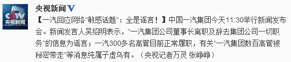 據(jù)央視記者報道,中國一汽集團今天11:30舉行新聞發(fā)布會。新聞發(fā)言人吳紹明表示,“一汽集團公司董事長離職及辭去集團公司一切職務(wù)”的信息為謠言;一汽300多名高管目前正常履職,有關(guān)“一汽集團數(shù)百高管被秘密帶走”等消息純屬子虛烏有。