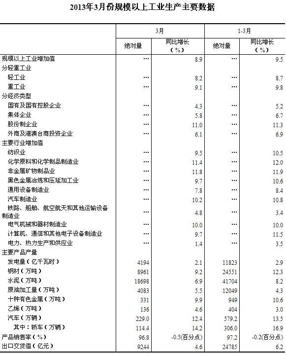 2013年3月份,規(guī)模以上工業(yè)增加值同比實際增長8.9