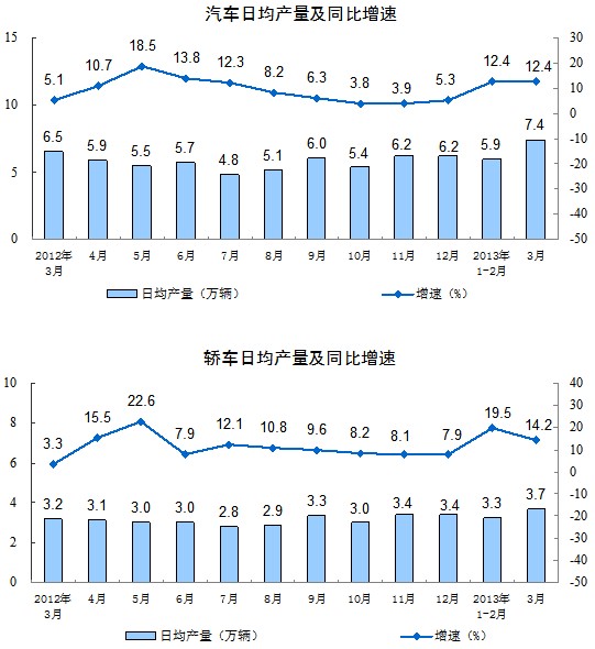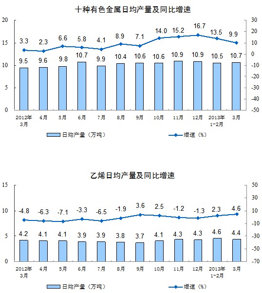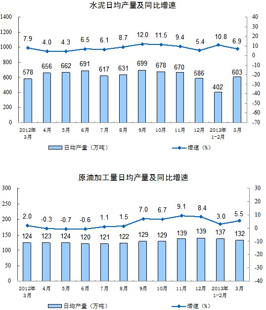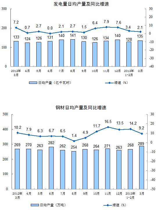 分產(chǎn)品看,3月份,464種產(chǎn)品中有296種產(chǎn)品同比增長。其中,發(fā)電量4194億千瓦時,同比增長2.1%;鋼材8961萬噸,增長9.2%;水泥18698萬噸,增長6.9%;原油加工量4083萬噸,增長5.5%;十種有色金屬331萬噸,增長9.9%;乙烯136萬噸,增長4.6%;汽車229.0萬輛,增長12.4%;轎車114.4萬輛,增長14.2%。