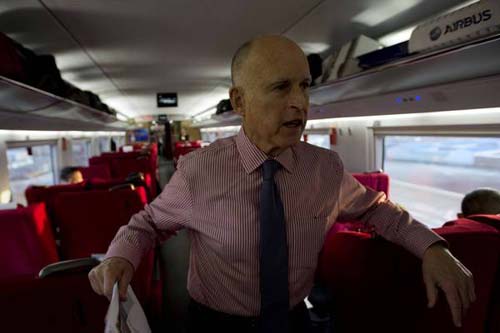 杰瑞-布朗率領(lǐng)的代表團(tuán)上周四晚間還乘坐了北京南站開往上海的高鐵,5個(gè)小時(shí)的旅程給代表們留下了深刻印象。北京到上海的高鐵全長(zhǎng)750英里大約相當(dāng)于從圣迭哥到俄勒岡的距離。杰瑞-布朗在高鐵動(dòng)車上發(fā)表了即興講話,并與同車的中國旅客握手交談。