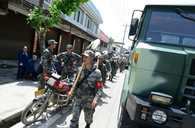圖為解放軍成都軍區(qū)某部向雅安蘆山地震災(zāi)區(qū)行軍。