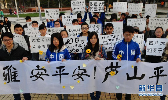 4月20日,山東聊城大學(xué)美術(shù)學(xué)院的大學(xué)生在為雅安地震災(zāi)區(qū)同胞祈福、加油。當(dāng)日8時(shí)02分,四川省雅安市蘆山縣發(fā)生7.0級(jí)地震。災(zāi)情牽動(dòng)著億萬(wàn)同胞的心,人們用不同的方式為雅安地震災(zāi)區(qū)人民祈福,哀悼地震遇難同胞。截至20日16時(shí)40分,雅安蘆山地震已造成四川113人死亡。新華社發(fā)
