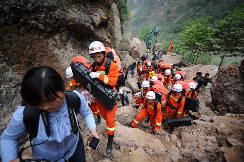 2013年4月20日15時(shí)起四川、重慶公安消防近600名戰(zhàn)士分期分批晝夜兼程徒步趕往在4.20蘆山地震中受災(zāi)較為嚴(yán)重的寶興縣城。