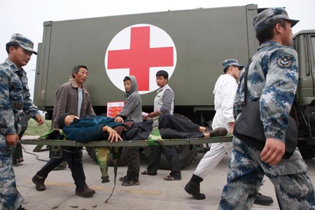 4月22日,在四川省蘆山縣龍門鄉(xiāng)安置點,救援人員將傷員抬往醫(yī)療點進行救治。 當(dāng)日,在地震災(zāi)區(qū)的各支救援隊伍進一步加快行動速度,爭分奪秒地深入到當(dāng)?shù)卣归_救援行動。
