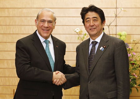 經(jīng)濟合作與發(fā)展組織秘書長安赫爾·古里亞(左)24日在東京與日本首相安倍晉三舉行會談。經(jīng)合組織在其發(fā)布的日本經(jīng)濟年度報告中,肯定了安倍政府近期推行的激進經(jīng)濟刺激政策,認為日本結(jié)束長達15年之久的通縮局面是當務之急。報告同時警告,日本應控制公共債務繼續(xù)膨脹。