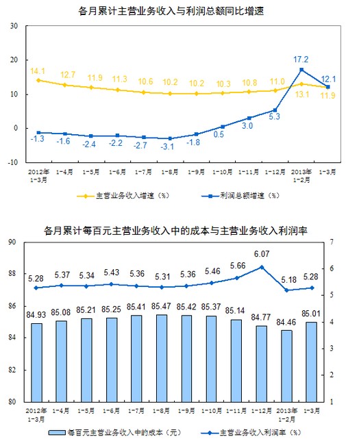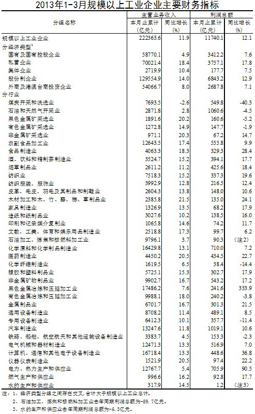 1-3月份全國規(guī)模以上工業(yè)企業(yè)實(shí)現(xiàn)利潤11740億元,比去年同期增長12.1%,增幅比1-2月份回落5.1個(gè)百分點(diǎn)。3月當(dāng)月實(shí)現(xiàn)利潤4649億元,比去年同期增長5.3%。