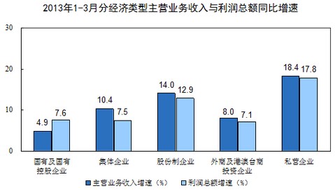 1-3月份在規(guī)模以上工業(yè)企業(yè)中,國有及國有控股企業(yè)實(shí)現(xiàn)利潤3412億元,比去年同期增長7.6%;集體企業(yè)實(shí)現(xiàn)利潤178億元,增長7.5%;股份制企業(yè)實(shí)現(xiàn)利潤6843億元,增長12.9%;外商及港澳臺(tái)商投資企業(yè)實(shí)現(xiàn)利潤2688億元,增長7.1%;私營企業(yè)實(shí)現(xiàn)利潤3757億元,增長17.8%。