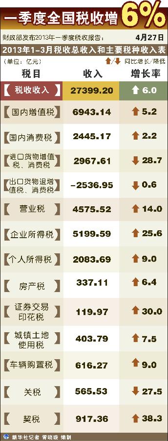 財政部27日發(fā)布2013年一季度稅收報告顯示,今年前三個月全國稅收總收入完成27399.20億元,比去年同期增長6%,增速回落了4.3個百分點,其中部分主體稅種出現(xiàn)負增長,而房地產(chǎn)相關(guān)稅收收入則出現(xiàn)反彈。