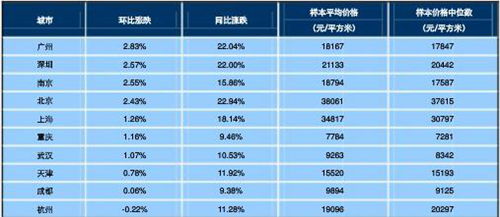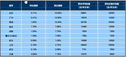 其中,北京、上海等十大城市住宅均價為17023元/平方米,環(huán)比上月上漲1.31%,與上年同期相比上漲7.89%。另外,按100個城市住宅價格的中位數計算,全國住宅價格中位數為6967元/平方米,環(huán)比上月上漲1.09%。