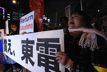 3月11日,在日本東京的東京電力公司總部前,游行者手持標(biāo)語(yǔ)、呼喊口號(hào)進(jìn)行抗議核電站的游行。游行者呼吁東電向福島市民賠償,并反對(duì)重啟核電站。新華社發(fā)(關(guān)賢一郎