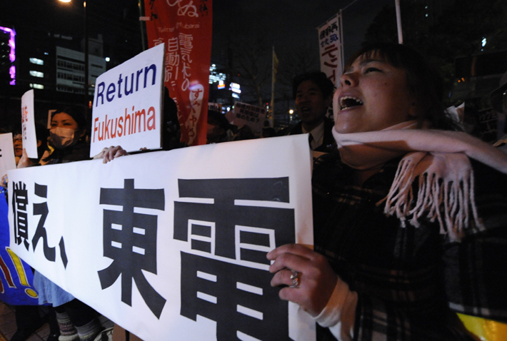 3月11日,在日本東京的東京電力公司總部前,游行者手持標(biāo)語、呼喊口號進(jìn)行抗議核電站的游行。游行者呼吁東電向福島市民賠償,并反對重啟核電站。關(guān)賢一郎/攝 |