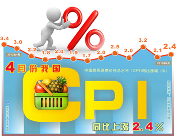 國家統(tǒng)計(jì)局9日公布,4月份全國居民消費(fèi)價(jià)格總水平(CPI)同比上漲2.4%,同比漲幅比3月份擴(kuò)大0.3個(gè)百分點(diǎn),略高于此前市場2.2%至2.3%的預(yù)期,環(huán)比也由3月份的環(huán)比下降轉(zhuǎn)為4月份的環(huán)比上漲0.2%。多方分析認(rèn)為,鮮菜價(jià)格上漲較多是推動(dòng)4月份CPI上漲的主要原因,受制于經(jīng)濟(jì)回升乏力,二季度物價(jià)將保持小幅平穩(wěn)上漲態(tài)勢。但是,考慮到豬肉價(jià)格很可能從三季度開始顯著上行,國內(nèi)外貨幣環(huán)境也依舊寬松,下半年物價(jià)加速上漲的概率仍然較大。