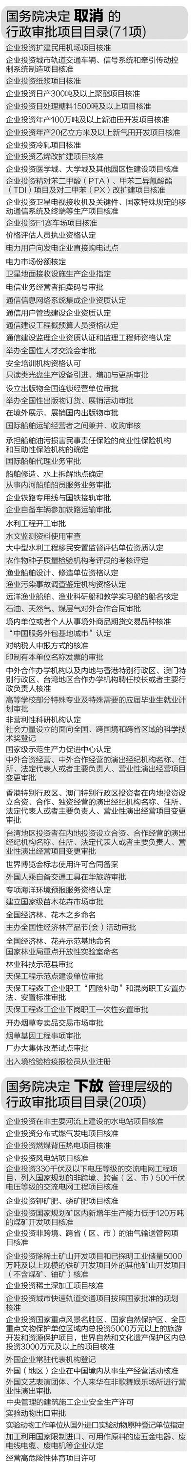 從具體項目看,主要有五種情況:一是投資審批事項。如取消發(fā)展改革委“企業(yè)投資乙烯改擴建項目核準”,下放其“企業(yè)投資風(fēng)電站項目核準”、“企業(yè)投資城市快速軌道交通項目核準”等。二是涉及企事業(yè)單位、社會組織生產(chǎn)經(jīng)營和業(yè)務(wù)活動的事項。如取消稅務(wù)總局“對納稅人申報方式的核準”、能源局“電力市場份額核定”、水利部“水利工程開工審批”、教育部“民辦學(xué)校聘任校長核準”等。三是涉及企事業(yè)單位和個人資質(zhì)資格許可認定的事項。如取消科技部“非營利性科研機構(gòu)認定”、商務(wù)部“機電產(chǎn)品國際招標機構(gòu)資格審批”、林業(yè)局“全國經(jīng)濟林花木之鄉(xiāng)命名”等。四是評比達標表彰評估和相關(guān)檢查活動。如取消住房城鄉(xiāng)建設(shè)部“城鎮(zhèn)房屋拆遷管理規(guī)范化考核”、人力資源社會保障部“留學(xué)人員創(chuàng)業(yè)園評估”等。五是行政事業(yè)性收費項目。如取消工業(yè)和信息化部“電子工程概預(yù)算人員培訓(xùn)費”等。此外,還有一些設(shè)立審批時的情況已發(fā)生變化、現(xiàn)在沒必要再審批的事項,以及一些屬于機關(guān)內(nèi)部事務(wù)審批、需要減少工作環(huán)節(jié)的事項。