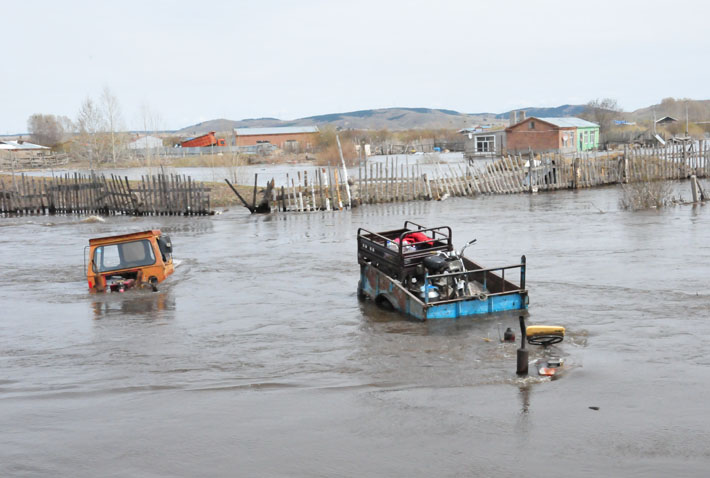 5月9日,伊敏河鎮(zhèn)的兩輛拖拉機被淹沒在洪水中。記者 鄒儉樸/攝 |