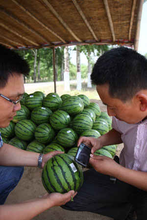 時(shí)下,正是西瓜種植大縣——河北省阜城縣“漫河牌”西瓜上市的季節(jié),每一個(gè)即將成熟的西瓜上都貼有二維碼,消費(fèi)者購買時(shí)用手機(jī)掃描二維碼,就可獲知西瓜的產(chǎn)地、品種、生產(chǎn)標(biāo)準(zhǔn)、授粉日期、種植戶名稱等內(nèi)容,實(shí)現(xiàn)對(duì)西瓜的追根溯源。目前,阜城縣4萬畝西瓜已有60%采用了二維碼技術(shù)。 |