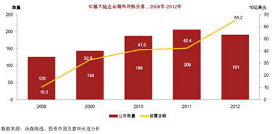 在數(shù)量方面,普華永道數(shù)據(jù)顯示,中國企業(yè)在過去5年中的海外并購數(shù)量分別為126起、144起、188起、206起和191起,一直保持在數(shù)量較大、增長較快的水平;而在金額方面,中海企業(yè)海外并購的總金額從2008年的103億美元迅速增長至2012年的652億美元,五年間增加五倍有余。另外,中國自2009年以來已占據(jù)五大新興市場中的領(lǐng)先地位,2012年中國的占比達到歷史新高,就交易金額而言,近70%新興市場對成熟市場的投資來自于中國。