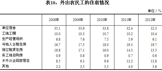以受雇形式從業(yè)的農(nóng)民工,在單位宿舍中居住的占32.3%,在工地或工棚居住的占10.4%,在生產(chǎn)經(jīng)營場所居住的占6.1%,與他人合租住房的占19.7%,獨(dú)立租賃住房的占13.5%,有13.8%的外出農(nóng)民工在鄉(xiāng)鎮(zhèn)以外從業(yè)但每天回家居住,僅有0.6%的外出農(nóng)民工在務(wù)工地自購房。從近幾年外出農(nóng)民工居住情況的變化看,呈現(xiàn)出與他人合租住房比重上升、獨(dú)立租賃住房比重下降的趨勢,另一明顯變化態(tài)勢是務(wù)工地自購房比重下降、鄉(xiāng)外從業(yè)回家居住比重上升。