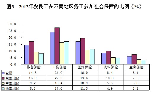 雇主或單位為農(nóng)民工繳納養(yǎng)老保險(xiǎn)、工傷保險(xiǎn)、醫(yī)療保險(xiǎn)、失業(yè)保險(xiǎn)和生育保險(xiǎn)的比例分別為14.3%、24%、16.9%、8.4%和6.1%,分別比上年提高0.4、0.4、0.2、0.4和0.5個(gè)百分點(diǎn)。從近五年調(diào)查數(shù)據(jù)看,外出農(nóng)民工養(yǎng)老保險(xiǎn)、醫(yī)療保險(xiǎn)、失業(yè)保險(xiǎn)和生育保險(xiǎn)的參保率提高4個(gè)百分點(diǎn)左右,而“五險(xiǎn)”中參保率相對較高的工傷保險(xiǎn)沒有明顯提高。