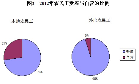 在外出農(nóng)民工中,受雇人員占95.3%,自營人員占4.7%;在本地農(nóng)民工中,受雇人員占72.8%,自營人員占27.2%。自營人員主要從事批發(fā)零售業(yè),占38.9%;其次是從事交通運(yùn)輸業(yè)倉儲和郵政業(yè)占19.3%,從事制造業(yè)占11.9%,從事服務(wù)業(yè)占11.2%。外出農(nóng)民工和本地農(nóng)民工中自營人員所占比重繼續(xù)呈下降趨勢,本地自營和外出自營分別比上年低0.9和0.5個(gè)百分點(diǎn)。