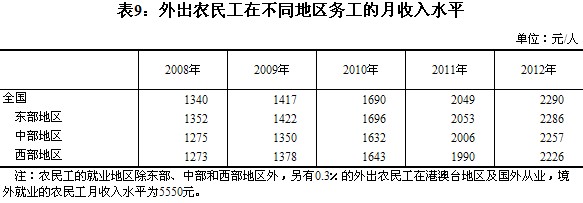 2012年末,外出農(nóng)民工人均月收入水平為2290元,比上年提高241元,增長11.8%,但增加額比上年同期減少118元,增幅回落9.4個(gè)百分點(diǎn)。分地區(qū)看,在東部地區(qū)務(wù)工的農(nóng)民工月收入水平為2286元,比上年增加233元,增長11.4%;在中部地區(qū)務(wù)工的農(nóng)民工月收入水平為2257元,比上年增加251元,增長12.5%;在西部地區(qū)務(wù)工的農(nóng)民工月收入水平為2226元,比上年增加236元,增長11.8%。另外,在境外就業(yè)的農(nóng)民工月收入水平為5550元。