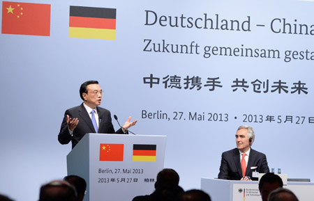 國(guó)務(wù)院總理李克強(qiáng)27日在柏林出席中德工商界午餐會(huì)并發(fā)表演講,介紹了中國(guó)經(jīng)濟(jì)形勢(shì)和中國(guó)新一屆政府的經(jīng)濟(jì)政策,提出深化中德、中歐合作的新主張。