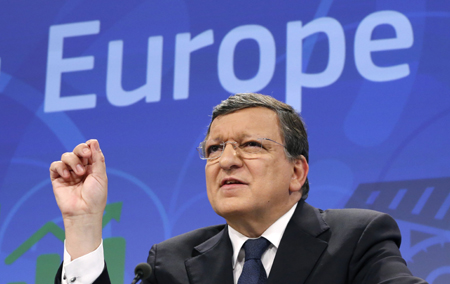 29日,歐盟委員會發(fā)布旨在推動歐盟擺脫危機并夯實增長基礎的“2013年成員國建議”,對區(qū)內各國(不含希臘、愛爾蘭與葡萄牙)及歐元區(qū)的預算、經濟與社會政策提出指導性意見。歐盟委員會同時提出,將逐步調整以財政緊縮為基礎的危機應對方案,同意給予法國、西班牙、葡萄牙、荷蘭以及斯洛文尼亞更多時間來實現(xiàn)各自的預算赤字削減目標。 圖為歐盟委員會主席巴羅佐當日在布魯塞爾出席新聞發(fā)布會。
