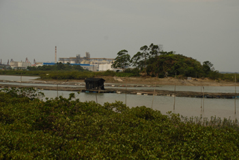 透過紅樹林向北眺望,一排白色油罐與幾個高聳的煙囪映入眼簾,這就是中石油廣西石化。記者