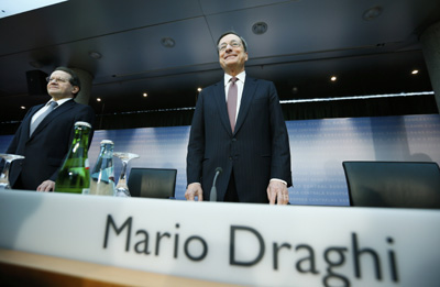 歐洲央行6日宣布維持基準利率0.5%不變。歐洲央行行長德拉吉(右)在發(fā)布會上指出,歐洲央行已做好采取進一步行動的準備,并將密切關(guān)注歐元區(qū)的經(jīng)濟和金融發(fā)展。