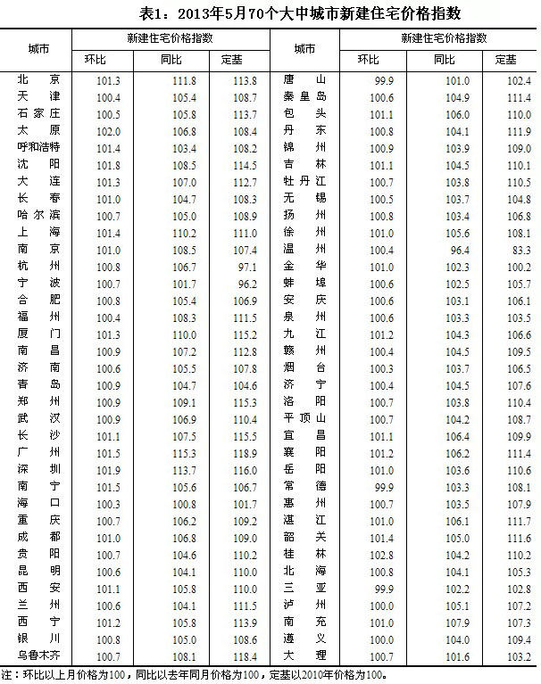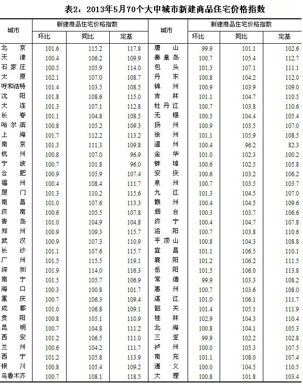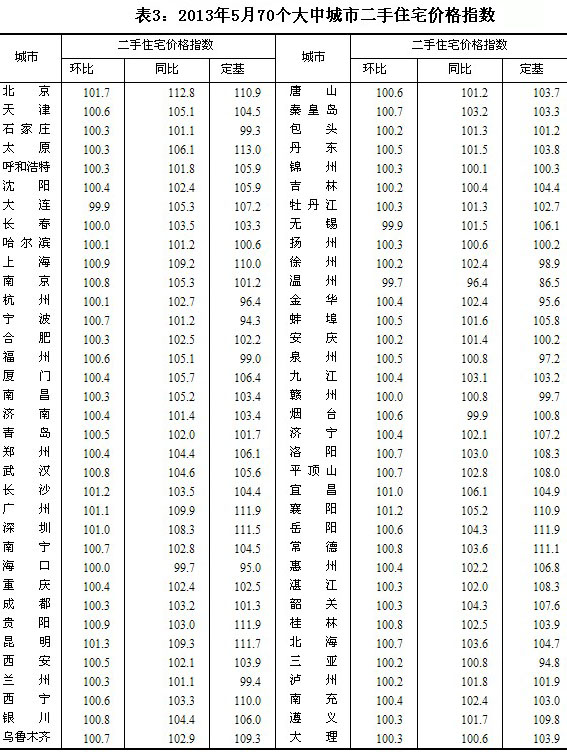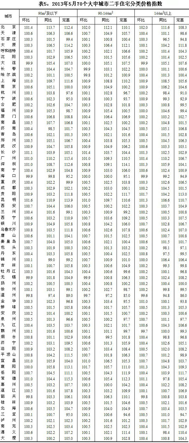 (二)與去年同月相比,70個(gè)大中城市中,價(jià)格下降的城市有3個(gè),上漲的城市有67個(gè)。5月份,同比價(jià)格上漲的城市中,漲幅最高為12.8%,漲幅比4月份回落的城市有5個(gè)。