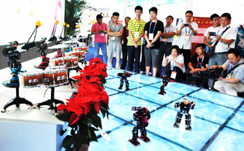 第24屆中國(guó)哈爾濱國(guó)際經(jīng)濟(jì)貿(mào)易洽談會(huì)的高新技術(shù)展區(qū),機(jī)器人舞蹈吸引了參會(huì)者的眼球。哈洽會(huì)是惟一被寫入中俄兩國(guó)元首會(huì)晤聯(lián)合公告的展會(huì)。記者 王建威/攝