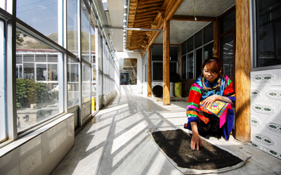 土族姑娘在自家陽臺晾曬糧食