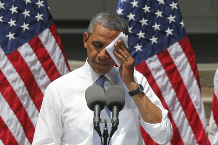 圖為奧巴馬發(fā)表講話時因天氣炎熱而擦汗。